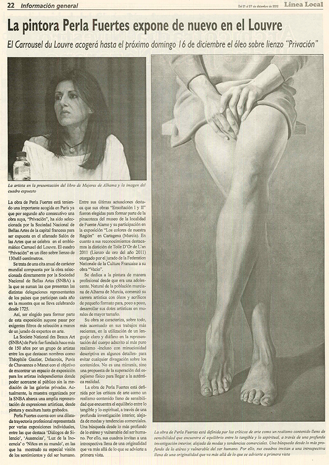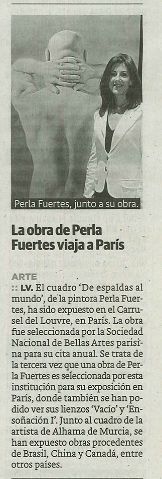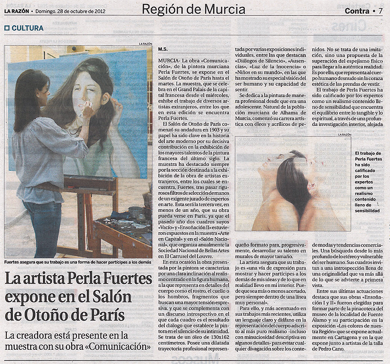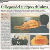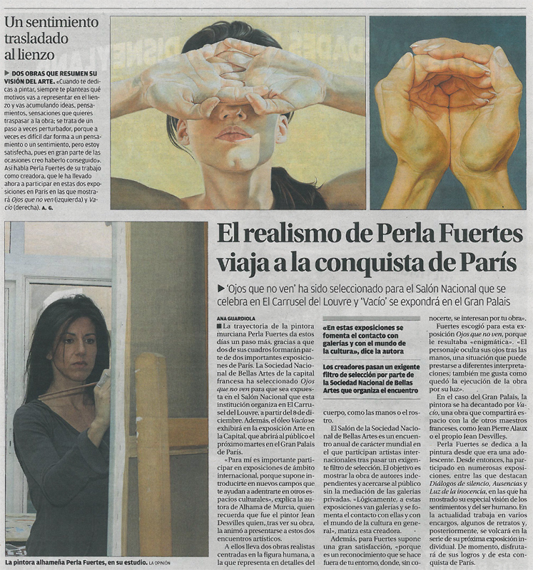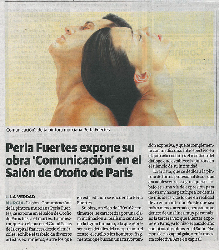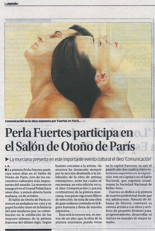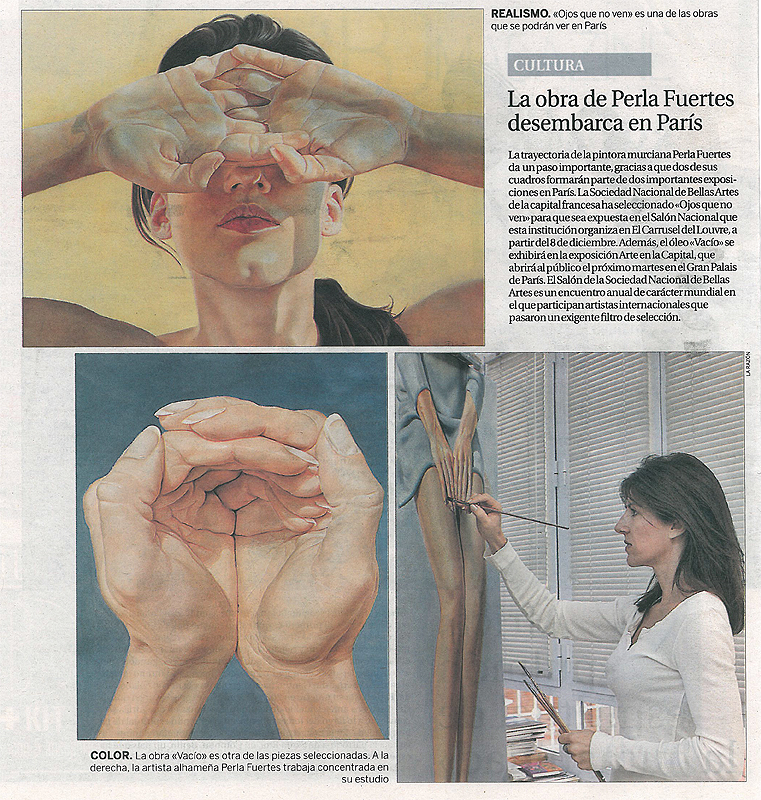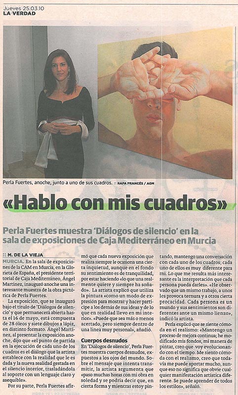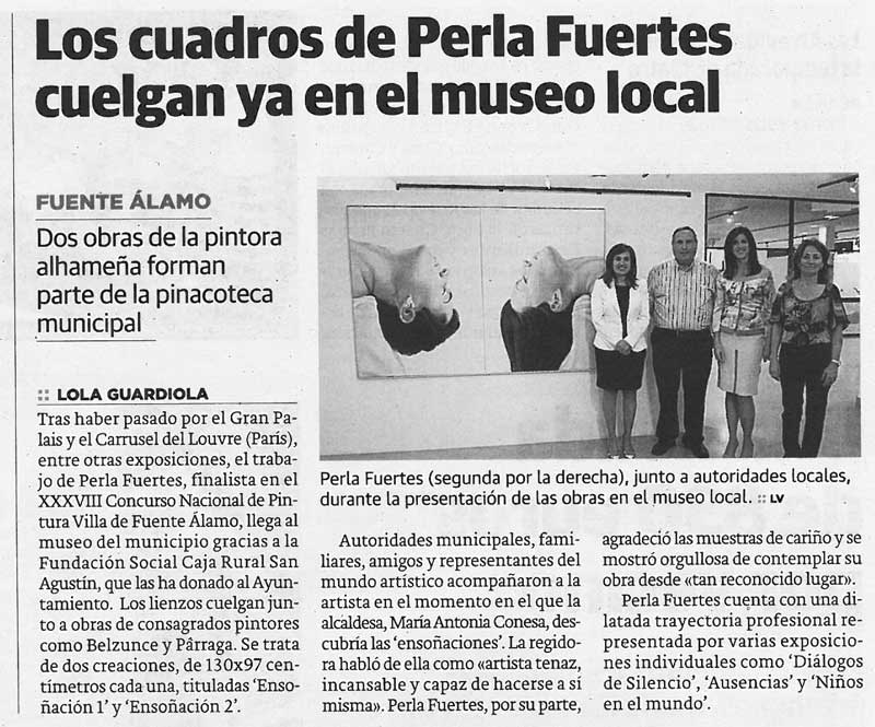 Su obra también puede verse a partir de este viernes en la Cámara de Comercio de Murcia. La pintora alhameña Perla Fuertes ha expuesto recientemente en Valencia y con gran éxito ya que ha vendido la totalidad de las obres expuestas. Una amplia representación de sus últimos cuadros pudo verse en la Feria Interart de Valencia. Esta XIX edición de la Feria Internacional de Valencia ha contado con la presencia de sesenta galerías españolas, entre ellas kim Gallery de Murcia, que es la que representa a Perla Fuertes. También ha habido una gran presencia de artistas extranjeros de modo que la feria ha ofrecido una panorámica de las últimas propuesta del arte internacional de este fin de siglo. Por otro lado, este viernes se inagura a las 20:00 una exposición en la que la Cámara de Comercio de Murcia conmemora sus cien años de existencia. En esta exposición se muestran las obras de 30 artistas de la región entre los que se incluye a Perla Fuertes. La muestra a pretendido reunir un conjunto de pintores que sean de lo más representativo posible del panorama pictórico regional. La pintura de Perla Fuertes ha sido definida así por Dionisio Paje, catedrático de Arte de Murcia: "La pintura de Perla es fundamentalmente intimista. En ella se refleja su mundo personal con buena técnica y concepto (...). Es una pintura que llega al espectadorm se remueve en lo más profundo de su ser y con ello cumple con la verdadera función de la obra artística".