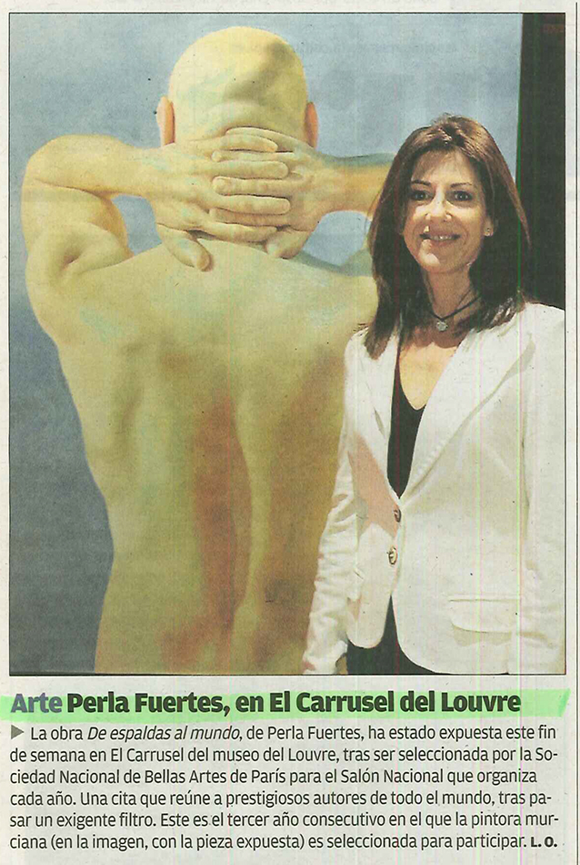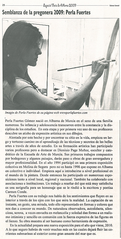 Perla Fuertes. Lleva dedicándose al mundo de la pintura desde que era una adolescente. Nauta de alhama de Murcia, comenzó su carrera artística con óleos y acrílicos de pequeño formato para poco a poco desarrollar sus dotes artísticas en granes murales. Su andadura profesional está marcada por numerosas exposiciones que se han convertido en asiduas desde el año 1994 y que han mostrado su especial universo por toda España.