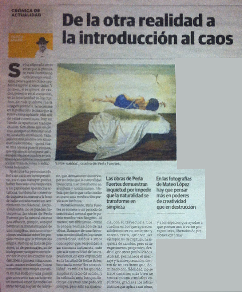 "Pueden existir dos procedimientos que la idea del cuadro le alcance como un rayo inesperadi - eso que los artistas definen como inspiración- o dejar que su pensamient capte, evolucione y decida, de un modo Imparable", explica el crítico de arte Pedro Soler en el catálogo de la exposicion de Perla Fuertes en al facultad de Bellas Artes de la Universidad de Murcia "Ser otra realidad"