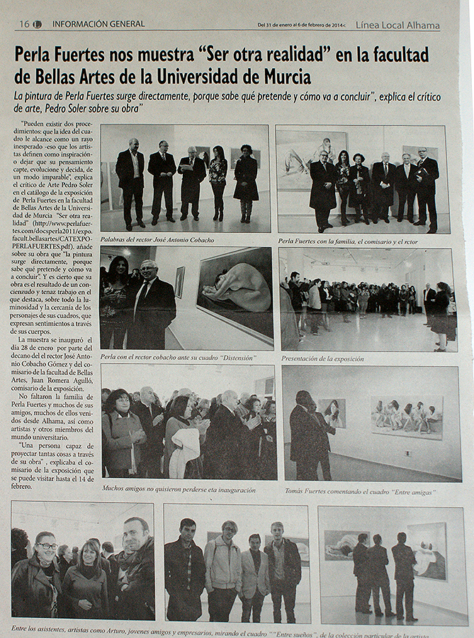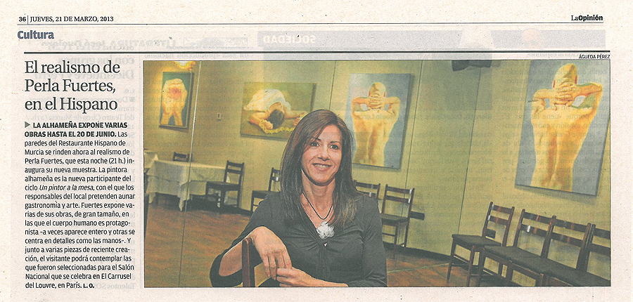 Hoy se inaugura en la galería de Murcia Kim Gallery una exposición de obras de la pintora alhameño Perla Fuertes. La artista muestra en la exposición, que permanecerá abierta hasta el 15 de junio, diversos óleos sobre madera en los que la figura infantil cobra una gran relevancia. La obra de Perla Fuertes, que expuso por vez primera en el Centro Cultural Plaza Vieja en 1998, ha comenzado a ser reconocida por críticos y especialistas del arte por lo que apunta a ser otra de los grandes artistas de nuestra región nacidos en Alhama. De su obra ha dicho el escultor y catedrático de la Escuela de Arte de Murcia, Dionisio Paje Muñoz, que "la línea es precisa y domina el conjunto, línea que será completada por las suaves matizaciones del color". En cuanto a la exposición referida, Paje añade que "en esta muestra mantiene su temática, pero insiste con nuevo acierto en unos planteamientos tanto estéticos como formales que abren en un mundo realmente sugerente y al que cuesta trabajo saberse resistir".
