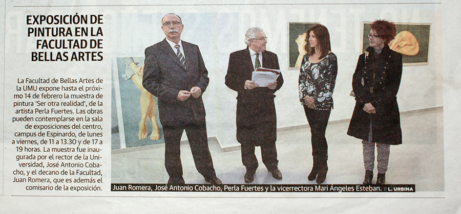 La Facultad de Bellas Artes de la UMU expone hasta el próximo 14 de febrero la muestra de pintura "Ser otra realidad", de la artista Perla Fuertes. Las obras pueden contemplarse en la sala de exposiciones del centro, Campus de Espinardo, de lunes a viernes, de 11 a 13.30 y de 17 a 19 horas.