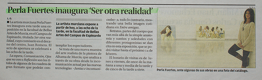 La artista murciana Perla Fuertes inaugura esta tarde una exposición en la facultad de Bellas Artes de Murcia, en el Campus de Espinardo, titulada Ser otra realidad, cuyo comisario es el decano del centro, Juan Romera. El acto de apertura se celebrará a las ocho de la Tarde.