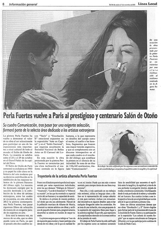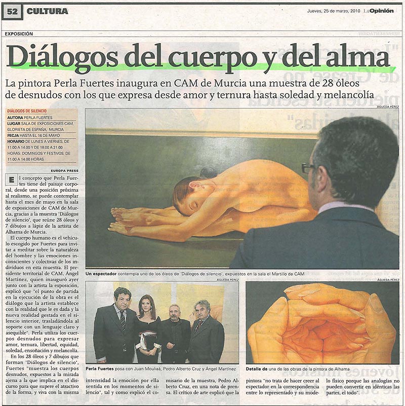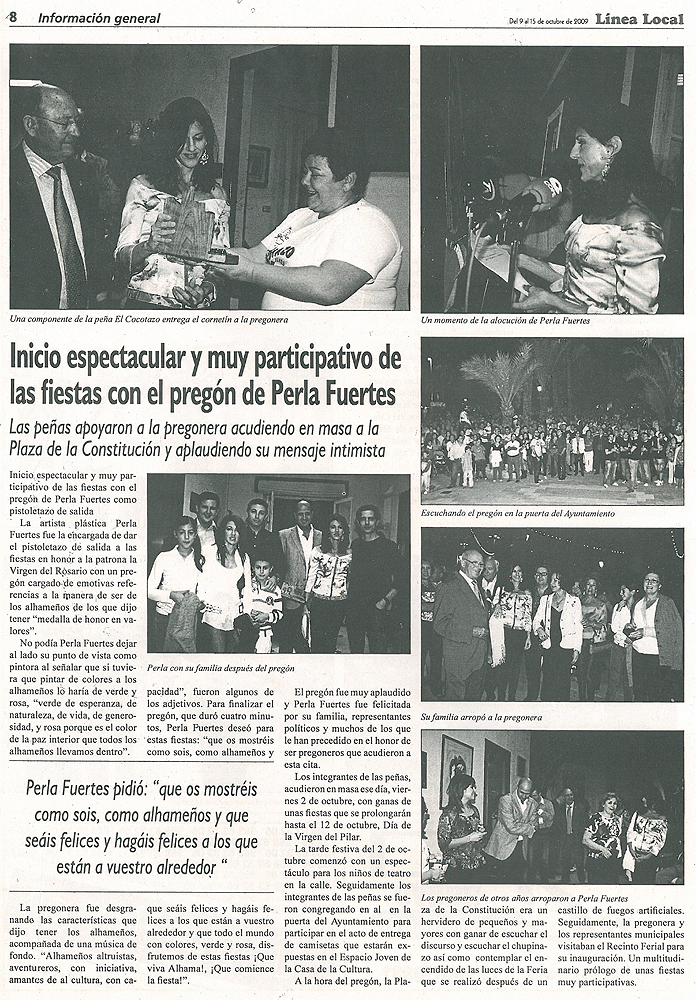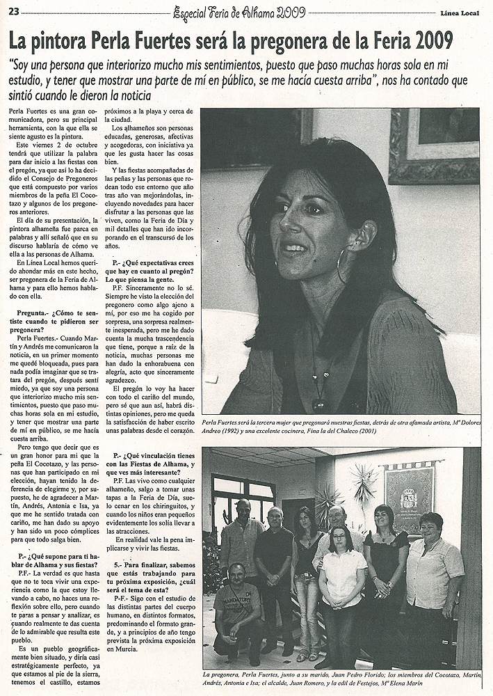 A la inaguración de su primera muestra individual asistió, entre otros, el pintor Aurelio. La pintora alhameña Perla Fuertes expuso por primera vez una muestra individual compuesta por 32 óleos y acrílicos. La inaguración fue abierta por el secretario general de Cultura Fernando de la Cierva a quien le siguió el alcalde Diego J. Martínez. La autora dedico unas palabras agradeciendo el apoyo del numeroso publico asistente, entre los que se encontraban entre otros, el consagrado pintor Aurelio Pérez. Durante la inaguración de la exposición, que permanecerá abierta hasta el día 23, se vendió más de la mitad de los cuadros.