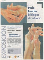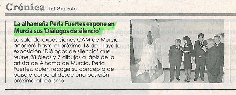 Perla Fuertes muestra una selección de sus óleos en la galeria Kim de Murcia. La pintora se dio a conocer gracias a la muestra realizada en 1998 en la sala de exposiciones del Ayuntamiento de Alhama de Murcia. Entre otras muestras, Perla Fuertes expuso en la feria de Interart de Valencia, junto con otra serie de artistas nacionales y extranjeros, y participó en la exposición de la Cámara de Comercio de Murcia, que congregó a 29 artistas con motivo del centenario de esta institución.
