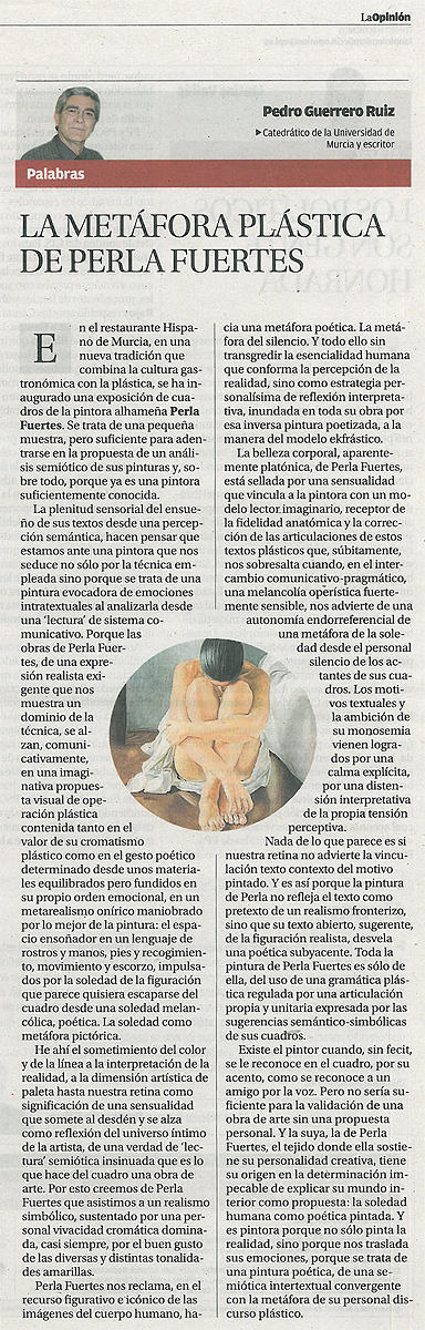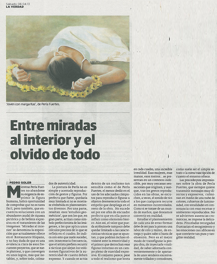 Y esto explica el realismo que define en estas obras a Perla Fuertes, tanto en su vertiente de pintora como de persona sensible. El camino emprendido, la vía de investigación interior, puede ser la base sobre la que levante el edificio de la auténtica creatividad: la que ella demanda, no la que viene impuesta por los intereses, pese a las máscaras, de las moda". Mari Trini Sánchez Dato.